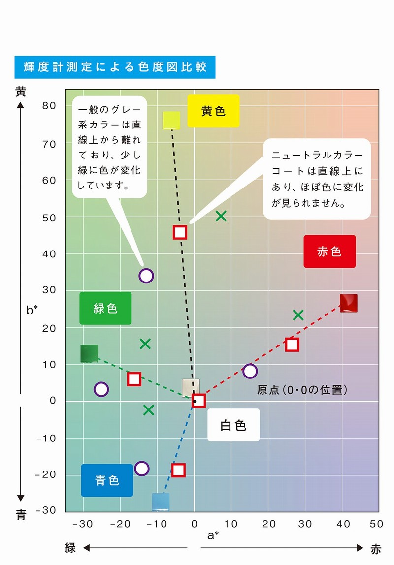 このニュートラルカラーコートは2種類(色の濃さ)あるのですが、どちらもほぼ全ての波長域で均一に波長域が低下しているのがわかるかと思います。