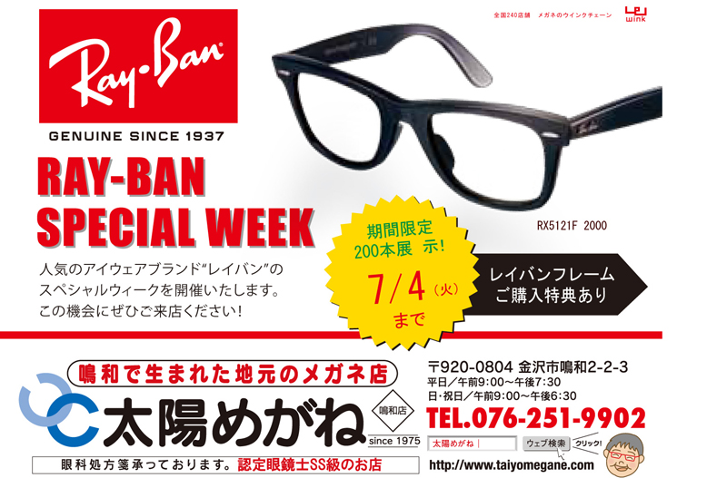 金沢市鳴和の太陽めがねではレイバンフェアー2017を開催しています。