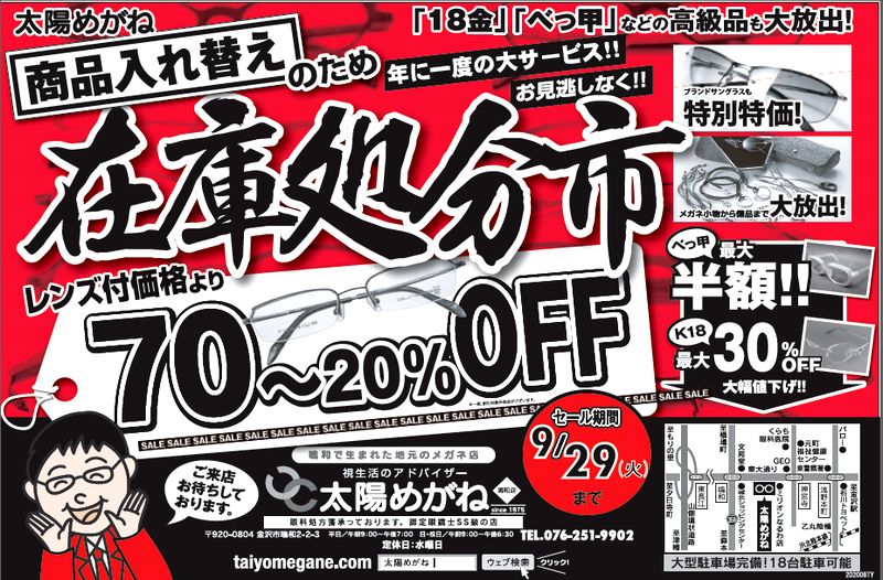今月は在庫処分市&40周年記念とダブルでお得!太陽めがねでお待ちしております~