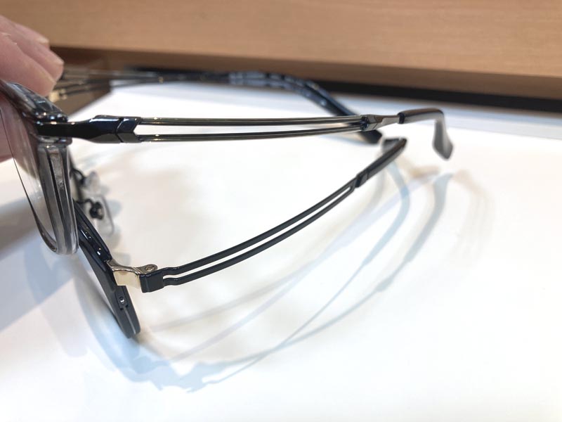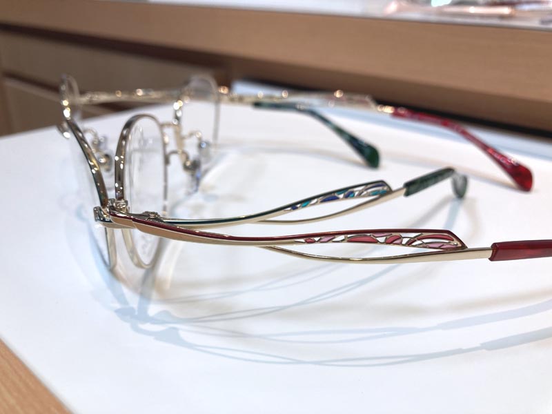「音楽で「輝かしく、華やかに」を意味するブリランテ。その構造が作り出すラインの造形とデザイン・カラーリングはまさに輝きを放ち、煌びやか。エクセレンスチタンとZチタンのハイブリッド構造にすることで、テンプルのバネバランスを最適にしつつ、かけた時の造形をキープし、最適のかけ心地を実現しました。」(メーカーHPより)