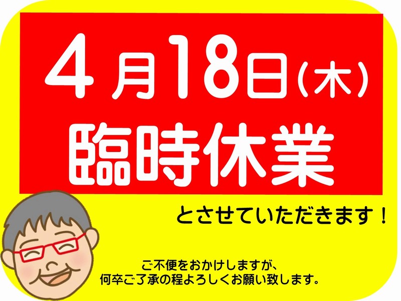 タイトルにもありますように、4月18日木曜日は臨時休業となります。ご迷惑をおかけしますがよろしくお願いいたします。また、4月17日は水曜日の為定休日です。17日、18日と連休となります<m(__)m>