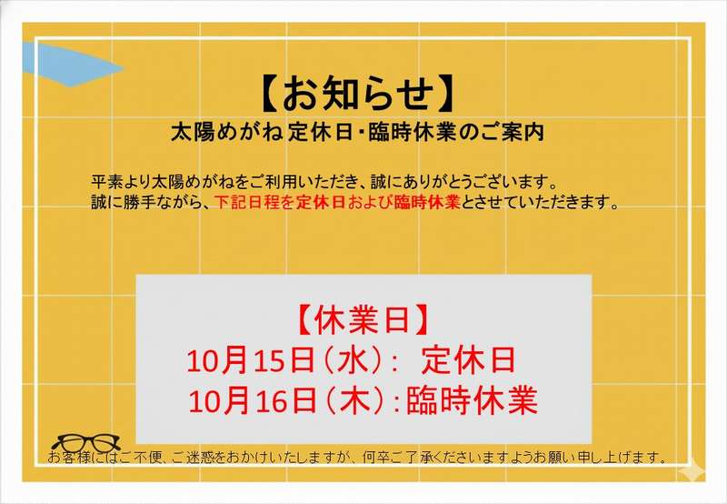 平素より太陽めがねをご利用いただき、誠にありがとうございます。 誠に勝手ながら、下記日程を定休日および臨時休業とさせていただきます。