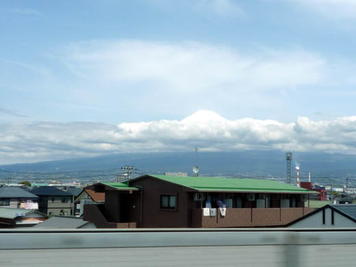 こちら恥ずかしくも無く窓から撮影です。真ん中雲の上に見える白いのが富士山です。