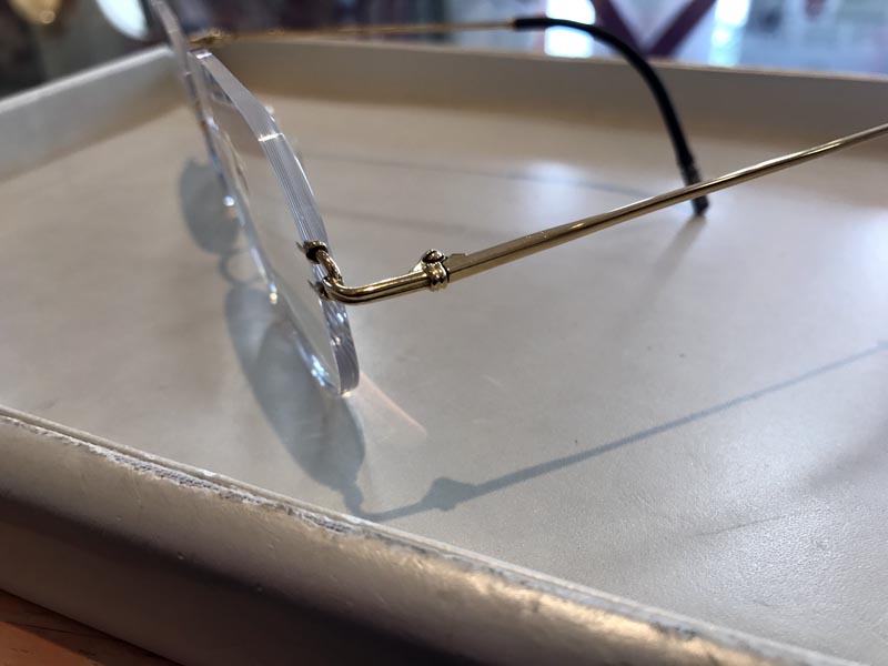 フチナシメガネは一般的にはレンズに穴を開け、レンズをボルトネジとナットで挟み込んでフレームに固定する構造になっています。