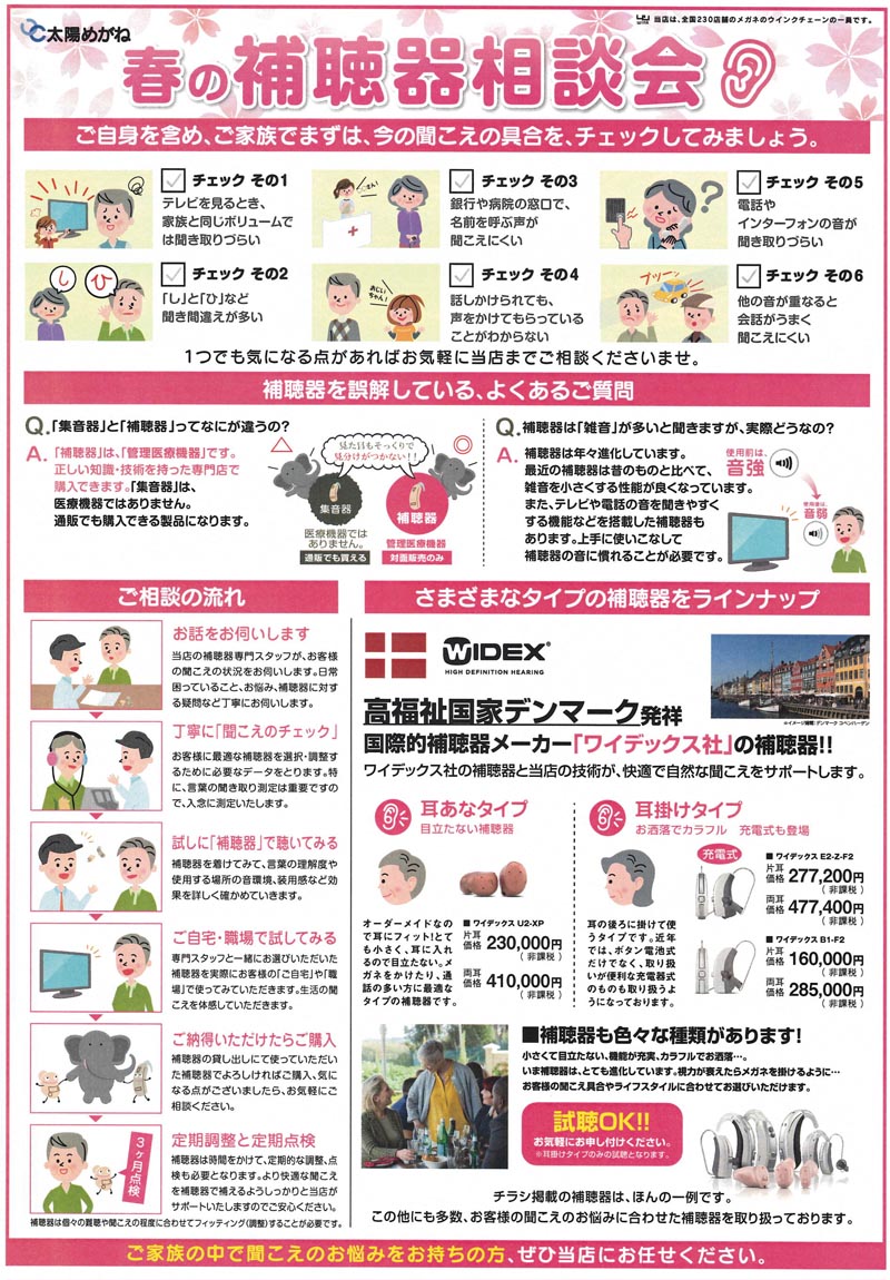 太陽めがねでは、現在春の補聴器相談会を開催しています!
