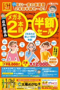 太陽めがね年に一度の創業祭!「めがね2本目半額セール!」です